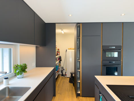 Die Küche in Schwarz & Holz überzeugt durch ihr modernes und zugleich zeitloses Design. Dunkle Fronten in edlem Schwarz werden harmonisch mit warmen Holzelementen kombiniert und schaffen so eine elegante Wohnatmosphäre. Klare Linien und hochwertige Materialien unterstreichen die handwerkliche Präzision der Blum Schreinerei AG. Die offene Gestaltung sorgt für ein luftiges Raumgefühl und lädt zum Verweilen ein. Funktionalität und Ästhetik gehen hier Hand in Hand – ein echtes Unikat aus regionaler Produktion.