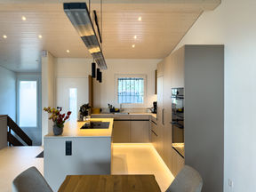 Die Küche präsentiert sich in einem klaren, modernen Design mit grifflosen Fronten und einer großzügigen Insel als zentralem Element. Die helle Arbeitsplatte bildet einen ruhigen Kontrast zu den neutral gehaltenen Schrankflächen, während die präzise Linienführung für ein harmonisches Gesamtbild sorgt. Eingebaute Geräte sind dezent in die Rückwand integriert, ergänzt durch eine durchdachte Beleuchtung mit Pendelleuchten über der Insel und zurückhaltender Deckenbeleuchtung. Natürlicher Lichteinfall durch das Fenster unterstreicht die offene, funktionale Gestaltung.